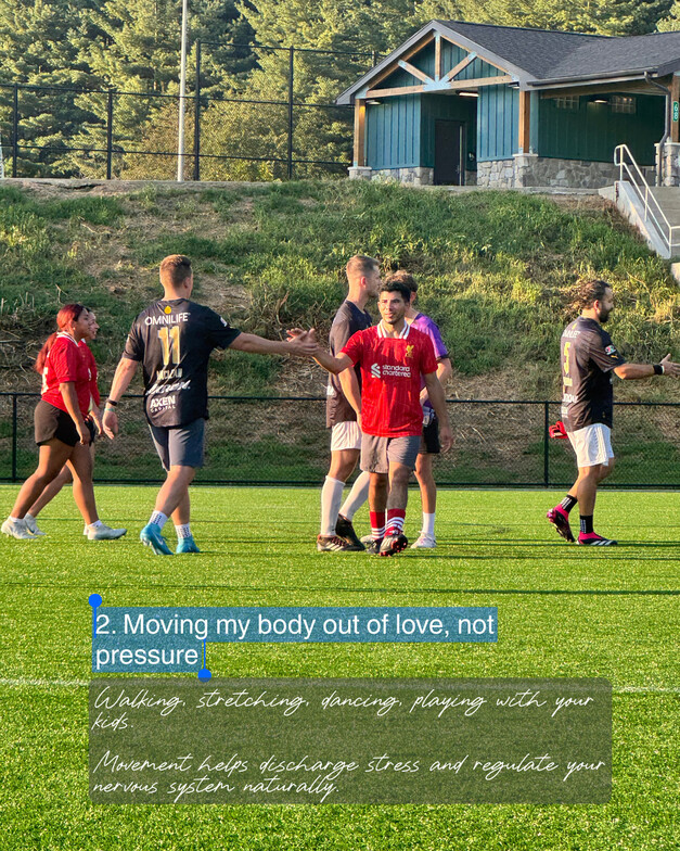 Not punishing workouts - movement that feels good. Walking, stretching, dancing, playing with your kids. Movement helps discharge stress and regulate your nervous system naturally.