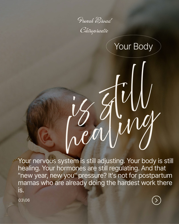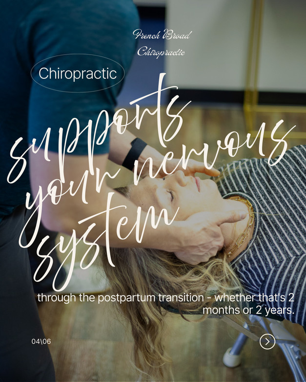 Chiropractic care supports your nervous system through the postpartum transition - whether that's 2 months or 2 years. We help with the physical recovery (balancing your pelvis and spine after pregnancy and birth, addressing "new mom posture" from constant holding and feeding, releasing tension that's making everything harder). And we support the emotional regulation piece (your nervous system controls your stress response, your ability to handle overwhelm, your mood stability).